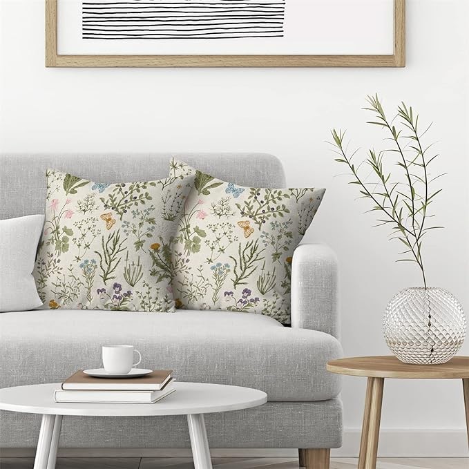 AEIOAE Spring Pillow Covers 18x18 Inch Set of 2,Sage Green Wild Flower Plant Throw Pillows Case,Seasonal Floral Outdoor Decorative Square Linen Farmhouse Decor Cushion Covers for Home Sofa Bed Couch