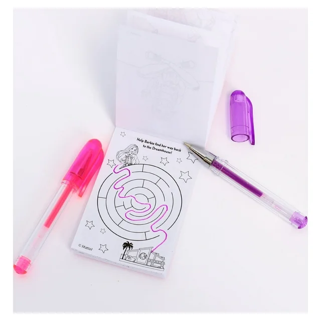 • Includes an activity journal, 2 gel pens, 2 mini Barbie character stampers and 3 sticker rolls.