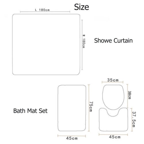 Shower curtain size: 180x180cm / 70.9x70.9in Bath mat set size: Square size: 75x45cm / 29.52x17.7in U shape size: 45x37.5cm / 17.7x14.7in Toilet cover size: 38x35cm / 15x13.7in,Manual measuring, please allow 1 ~ 5 cm error,thank you.