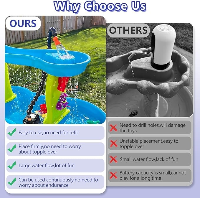 • 【Water table pump】:Our high-quality water table pump is a must-have gift for children.It will make your kids water table more interesting,cause water to circulate and splash above it,make children have more fun.