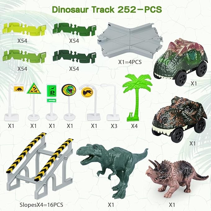 • Toy Train Set Tracks: 216 Track Pieces - 4 Tree - 2 Dinosaurs - 2 Dinosaur Cars - 1 X-shape Crossroad - 4 Slopes - 8 Traffic Signs.
