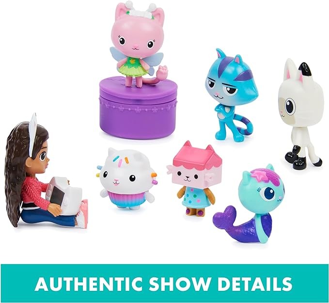 • 7 TOY FIGURES: This cat-tastic figure set is perfect for pretend play! Includes Gabby and her adorable and irresistible kitty friends Pandy Paws, MerCat, Cakey Cat, Kitty Fairy, CatRat and Baby Box Cat!