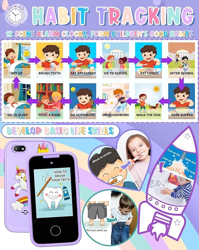 【ALL IN ONE KID'S SMART PHONE】: With 23 entertainment, educational, and practical functions including games, drawing, music, taking photos, letter cards, habit tracking, audio books, calendars, etc., this smart cell phone meets all kids’ needs. School mode allows parents to control playtime. Kids can customize the phone from 31 wallpapers and 11 themes.