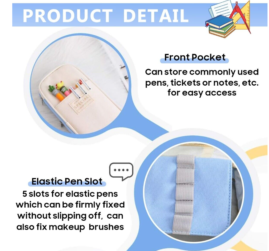 - Large enough to store all the stationery stuff, including a mesh zipper pocket and several loops compartment, also comes with a front pocket