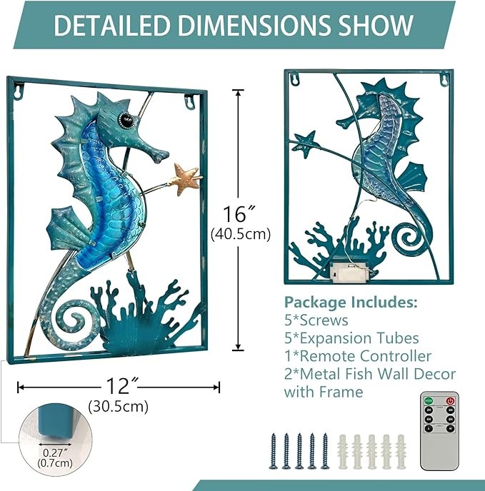 • ?【???? ????】:The metal wall decor Seahorse are the best gift for fish enthusiasts. It is also an ideal gift for home decoration. A perfect choice as a gift for Mom/Grandma/Wife/Daughter/Sister/Aunt/Grandma,girlfriend/boyfriend, wife's wedding anniversary, child's birthday,mother's birthday, or Mother's Day, Father's Day,Thanksgiving Day,Valentine's Day and Christmas.