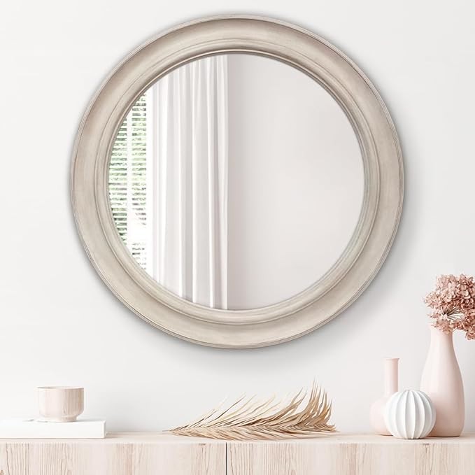 • ★【It's In The Details】: Designed to tastefully add an accent of design anywhere in the home. This wall mounted mirror is crafted of no-distortion HD glass mirror and durable ABS composite frame, which is hand painted/brushed with weathered white finish to details.