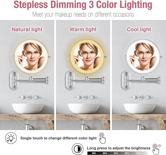 • Stepless Dimming and 3 Color Lighting: This vanity mirror provides natural light,warm light and cool light for you to choose,You can apply 3 different settings for different lighting effects,Just touch to choose your lighting preference.Easily change light patterns by single touch switch and long press to adjust the brightness to meet your makeup needs on different occasions.