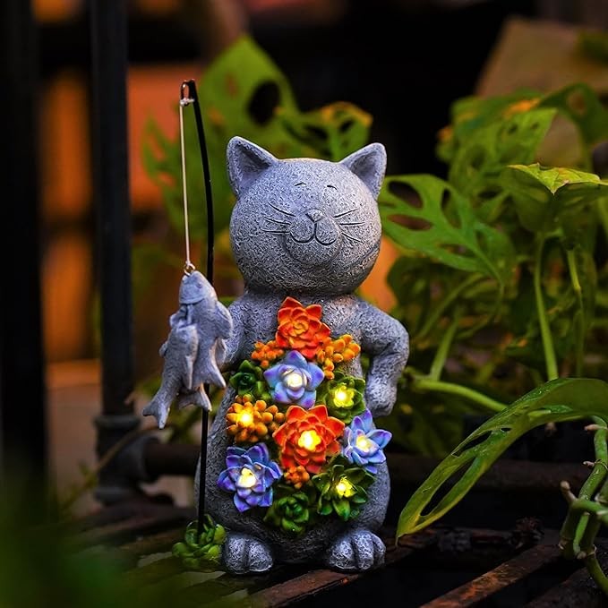 • 【Be different from others】Our cat statue has a fishing look, and the flowers on the cat will glow at night, adding a beautiful shape to your garden and making your yard even more attractive
