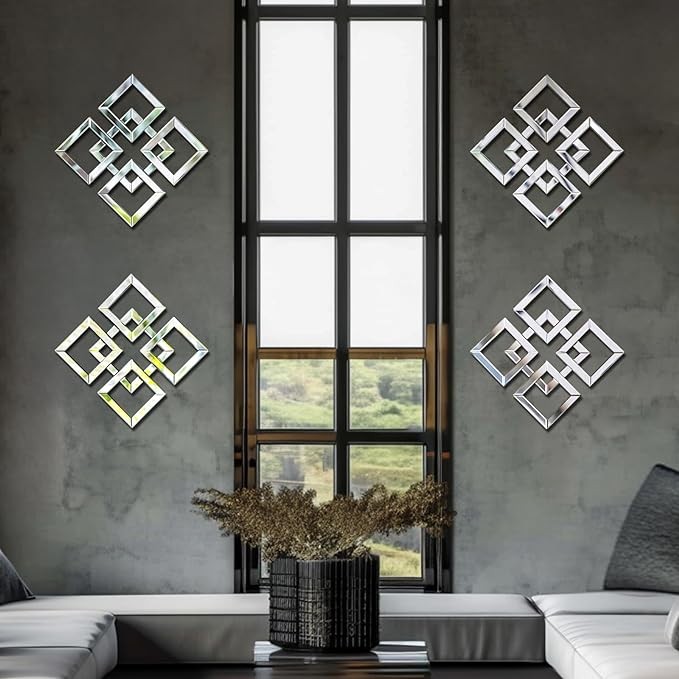 Walasis Decorative Mirrors for Wall Decor Modern - Geometric Wall Mirror 12inch Silver Square Glass Art with Beveled Fashion Mirrored Accent for Living Room Bedroom Bathroom Entryway 4 Pcs